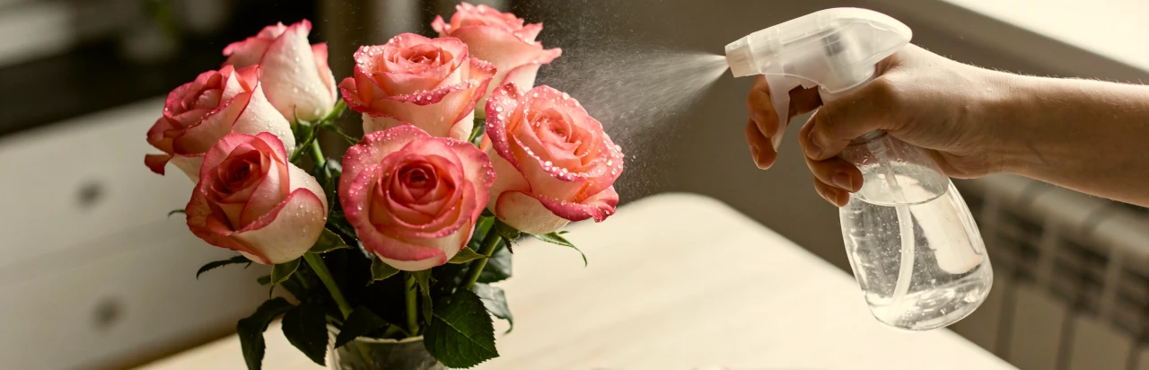 Опрыскивание повышает влажность вокруг бутонов, компенсируя испарение через лепестки. Используйте прохладную отстоянную воду, избегайте попадания крупных капель в центр раскрытых цветков — это провоцирует гниение. Опрыскивайте розы в утренние часы и вечером, когда нет прямого солнца.