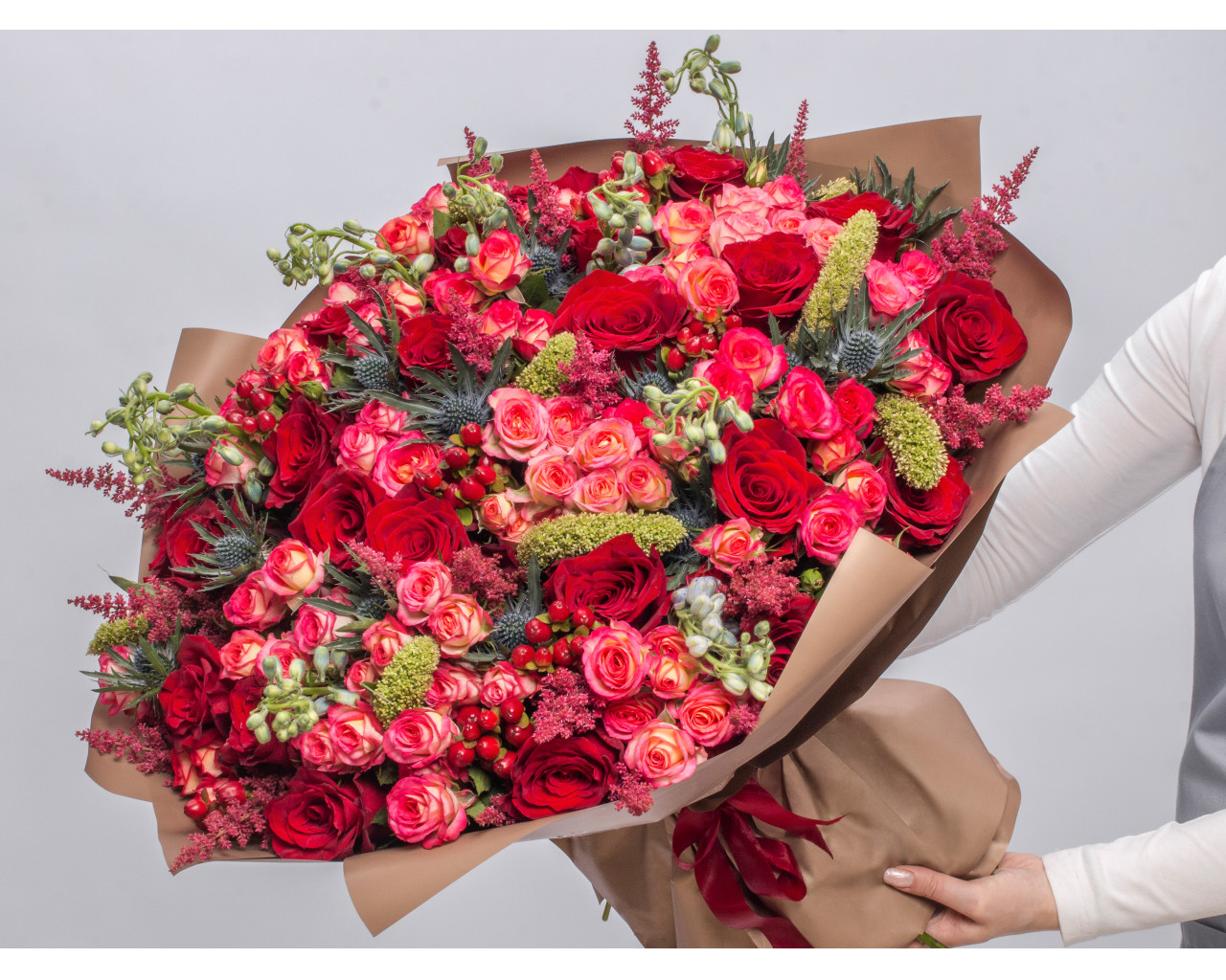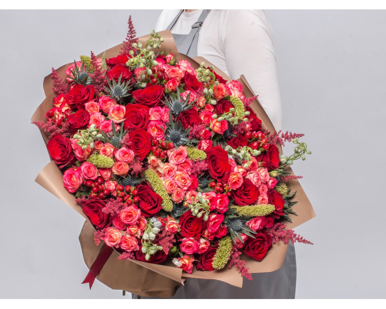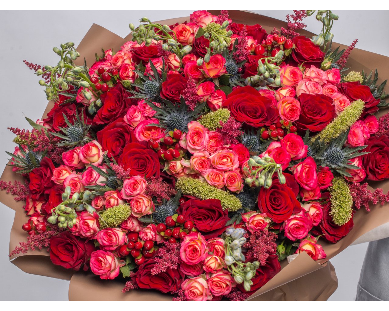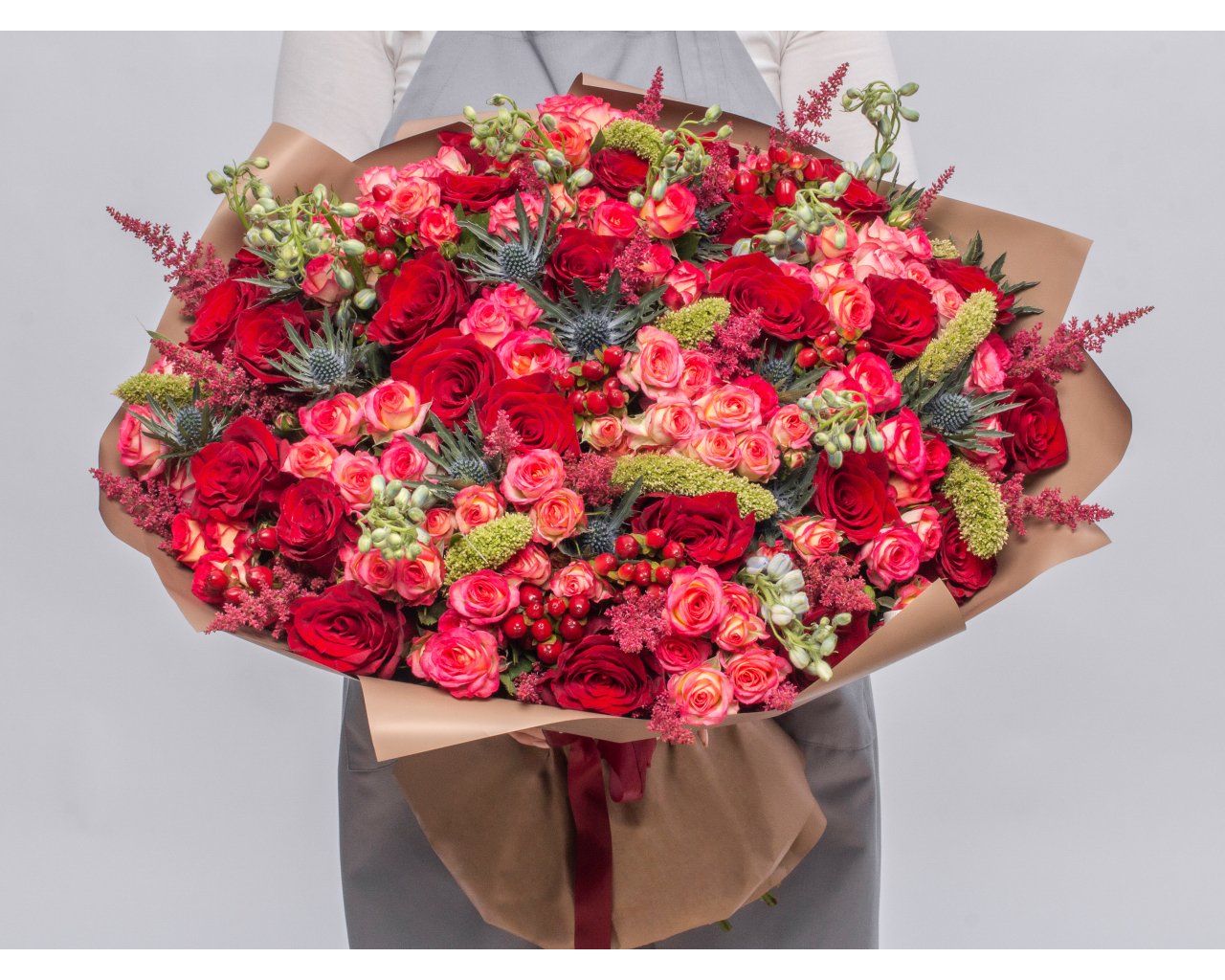 Состав: роза Эквадор 40-50 см 17 шт., роза кустовая Кения 70 см 10 шт., астильба 20 шт., маттиола 10 шт., эрингиум 5 шт., хиперикум 10 шт., зеленые шишки 1 шт., пленка 6 шт., лента 2 шт.