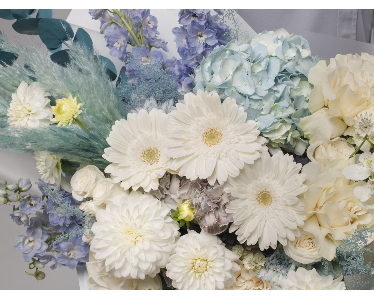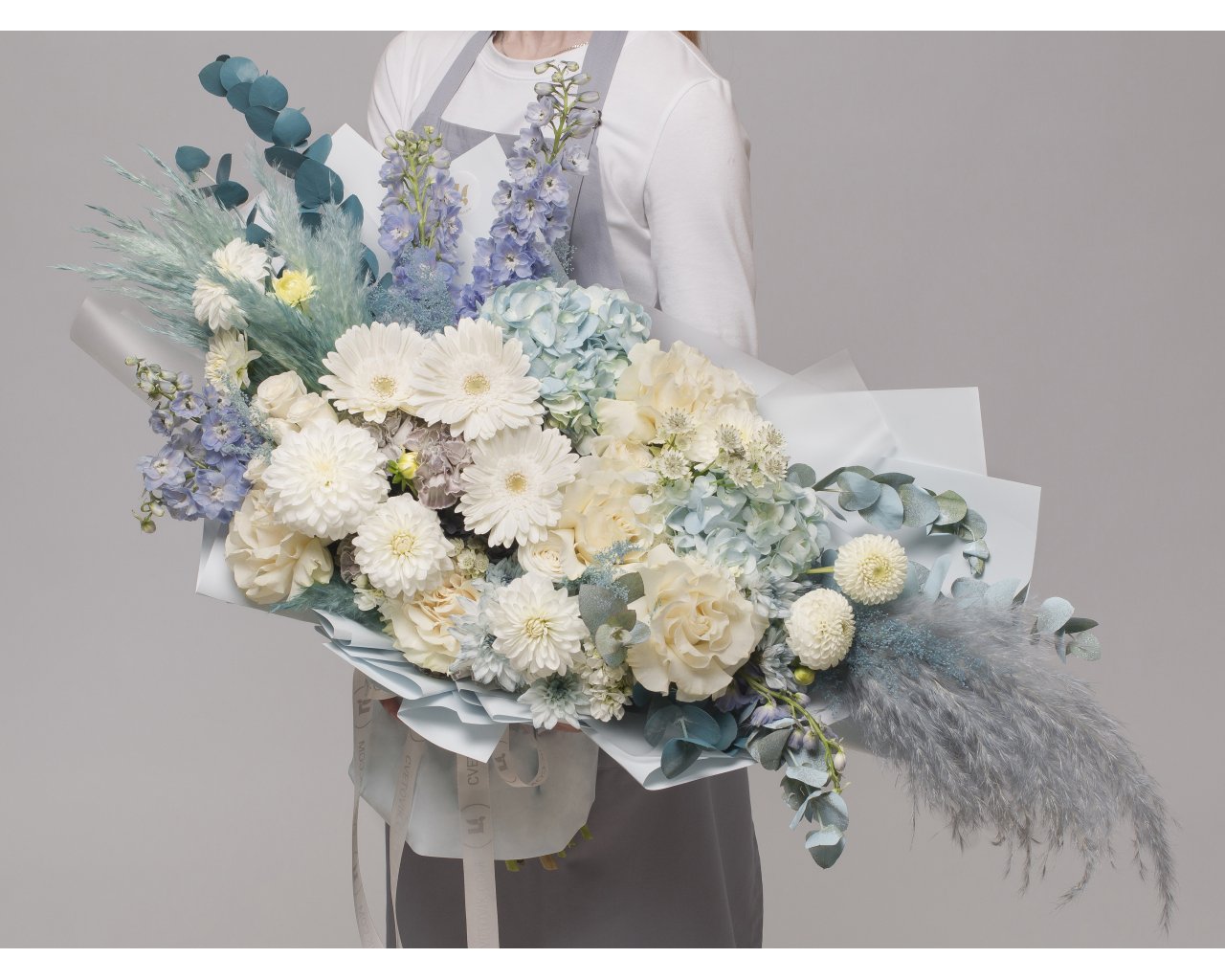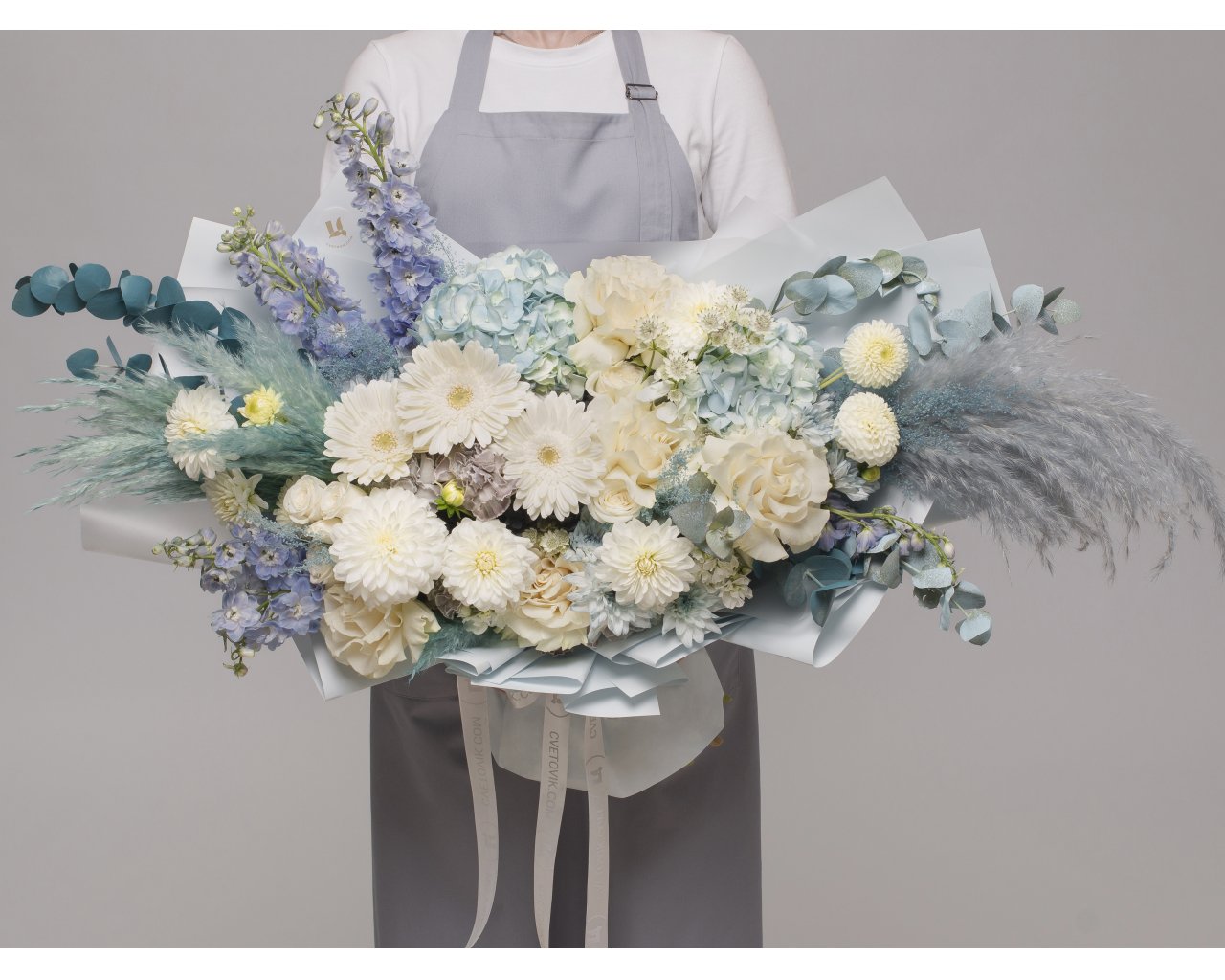 Состав: гербера 3 шт., георгины 10 шт., гвоздика 10 шт., гортензия 3 шт., дельфиниум 5 шт., роза Эквадор 40-50 см 5 шт., эвкалипт 1 шт., кортадерия 2 шт., астранция 5 шт., пленка 5 шт., лента 2 шт.