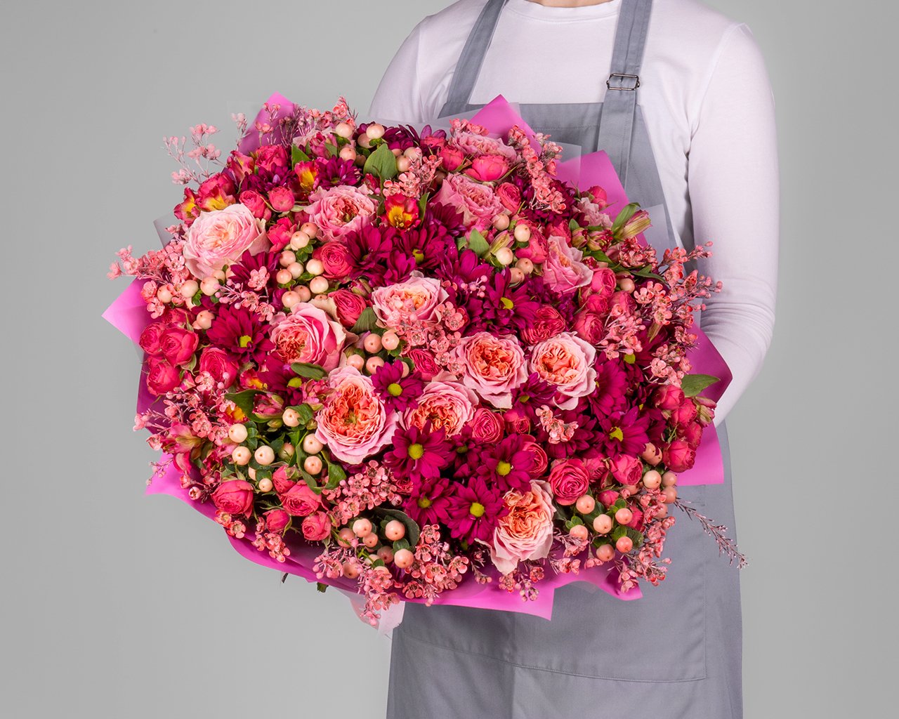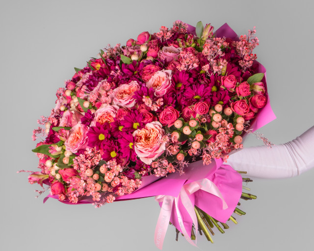 Состав: роза Эквадор 40-50 см 15 шт., хризантема куст. 10 шт., альстромерия 10 шт., роза Кения куст 70 см 10 шт., хиперикум 10 шт., хамелация 10 шт., пленка 4 шт., лента атласная 2 шт.
