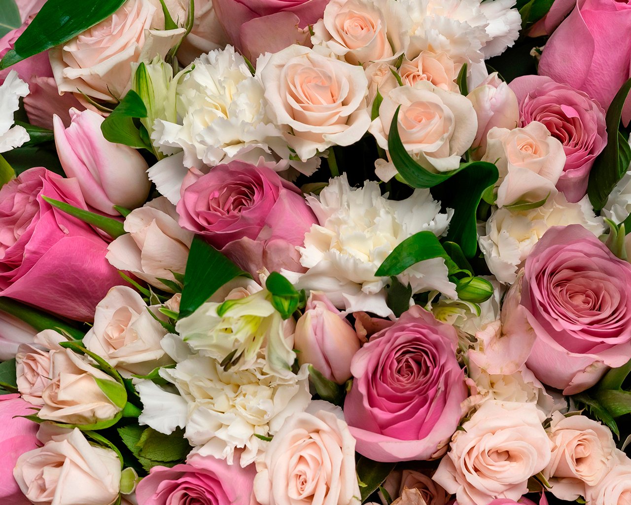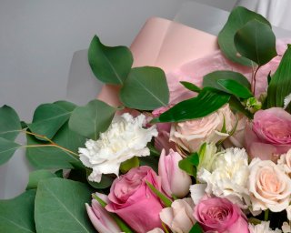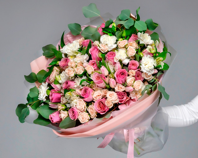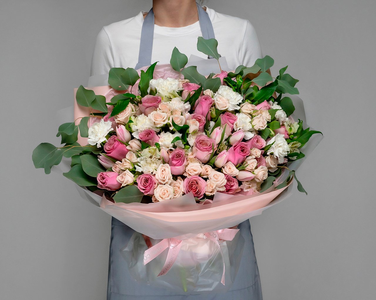 Состав: роза Кения 35-40 см 20 шт., роза Кения куст 40 см 10 шт., гвоздика 15 шт., альстромерия 10 шт., тюльпаны 10 шт., эвкалипт банч, тишью 4 шт., пленка 4 шт., лента 2 шт.