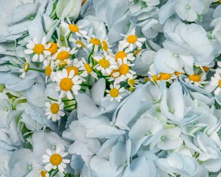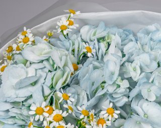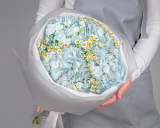 Состав: гортензия 1 шт., матрикария 2 шт., пленка 1,5 шт., лента 1 шт.