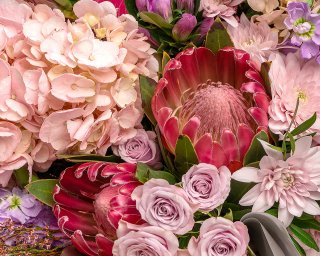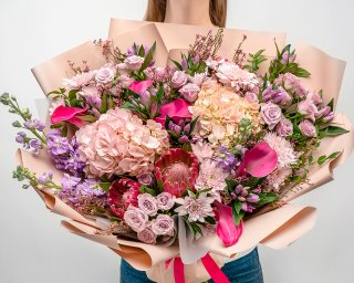 Состав: гортензия 2 шт., хризантема куст. 5 шт., роза Кения куст. 60-70 см 7 шт., маттиола 3 шт., протея 3 шт., калла 5 шт., каапс 5 шт., гентиана 7 шт., фисташка 5 шт., пленка 4 шт., лента 1 шт.