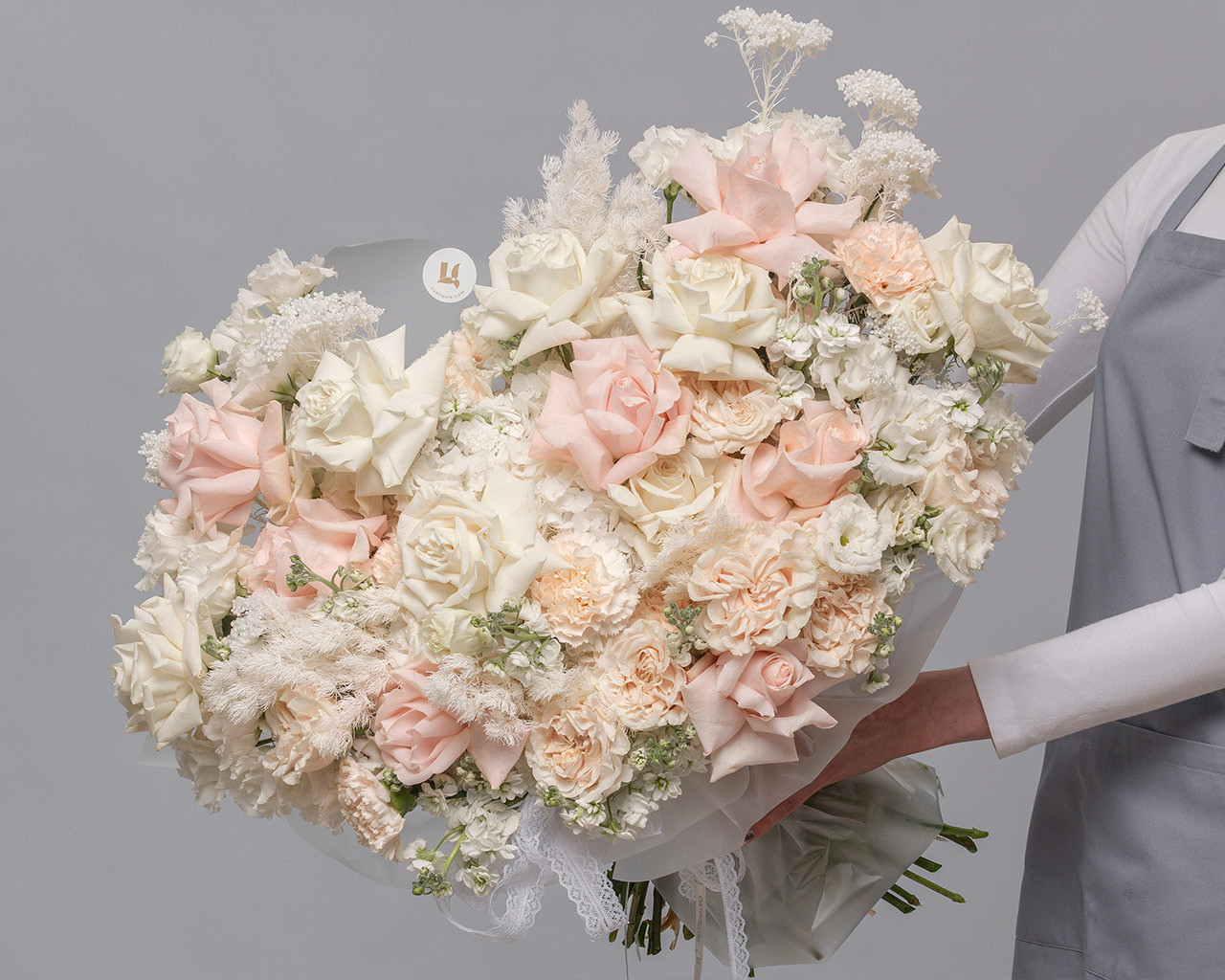 Состав: роза Премиум 40-50 см 21 шт., гвоздика 15 шт., маттиола 15 шт., альстромерия 10 шт., гвоздика куст. 10 шт., садовая роза куст. 10 шт., лизиантус 10 шт., сухоцветы банч 2 шт., пленка 4 шт., лента атласная 2 шт., лента кружевная 2 шт.