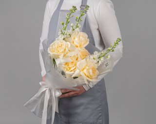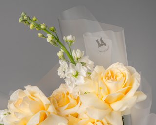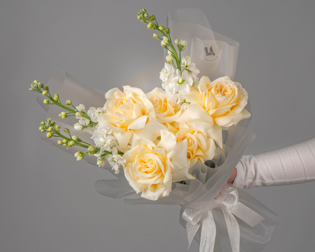 Состав: роза Эквадор 40-50 см 5 шт., маттиола 3 шт., пленка 1,5 шт., лента 1 шт.