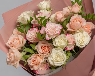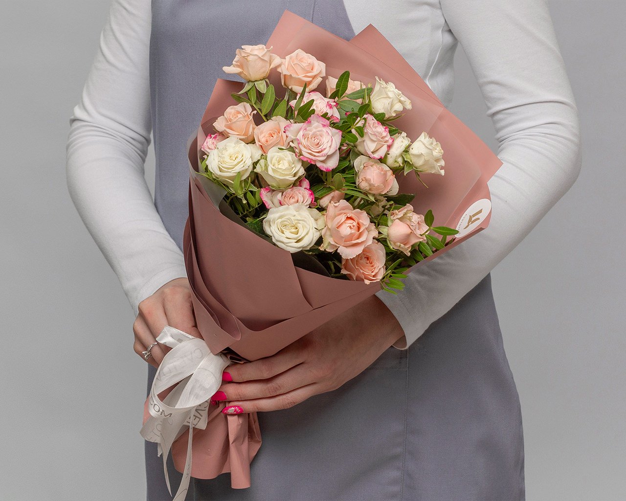 Букет из 5 белых и розовых кустовых роз 40 см (Кения) с зеленью фисташки