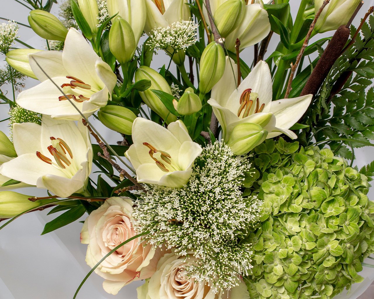 Состав: гортензия 1 шт., лилия азиатская 3 шт., роза Эквадор 40-50 см 2 шт., трахелиум 5 шт., папоротник 1 шт., берграс 0,3 шт., берк 5 шт., тишью 2 шт., пленка 1,5 шт., лента 2 шт.