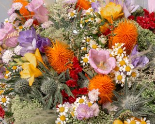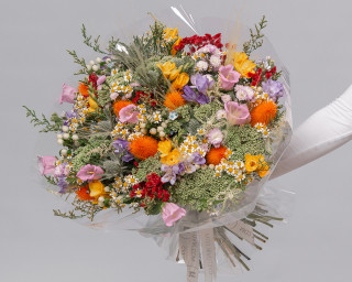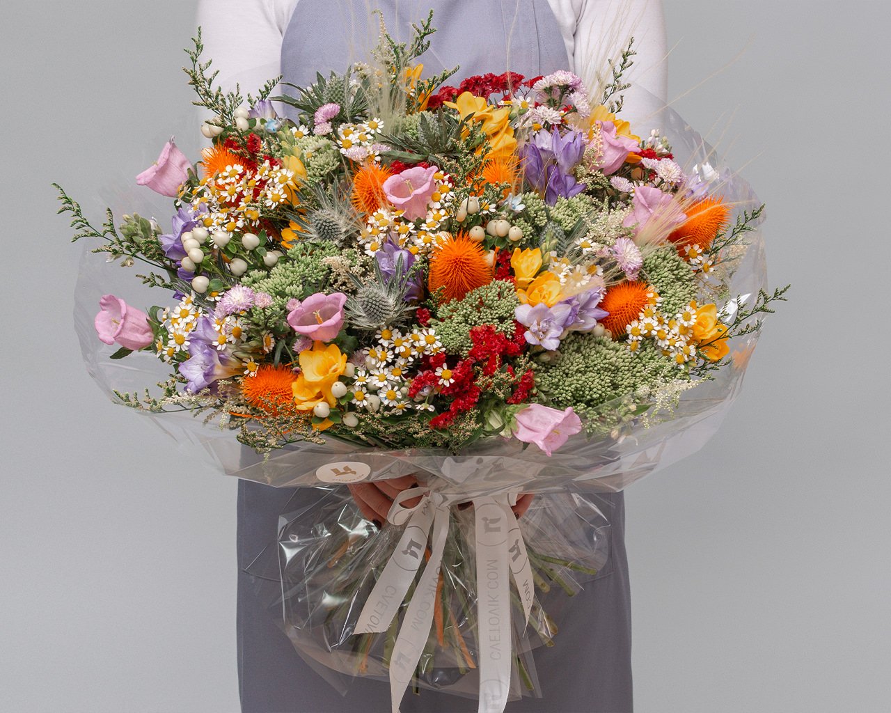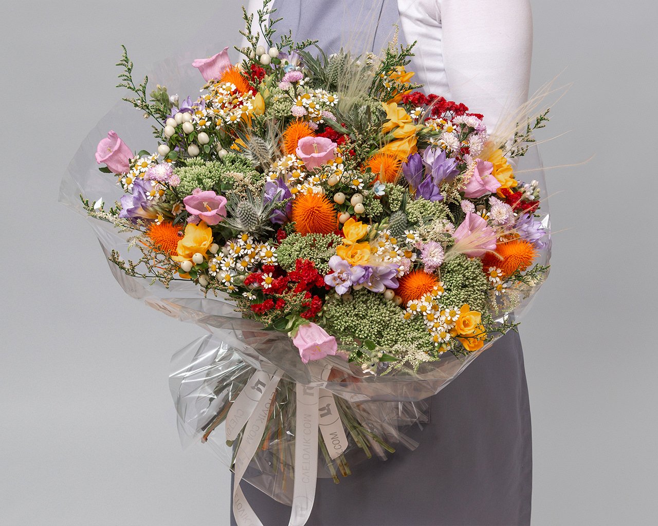Состав: седум 7 шт., астильба 9 шт., матрикария 13 шт., кампанула 10 шт., фрезия 15 шт., хиперикум 10 шт., эрингиум 9 шт., твидия 10 шт., астра 10 шт., лимониум 5 шт., ворсянка 0,7 шт., ковыль 1 шт., лимониум стаб. 0,6 шт., пленка 2 шт., лента 3 шт.
