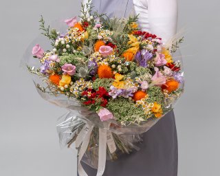 В букете есть сезонные цветы - они могут быть заменены на аналогичные по стоимости с сохранением концепции букета. Указанные цены действуют при оформлении заказа на сайте.