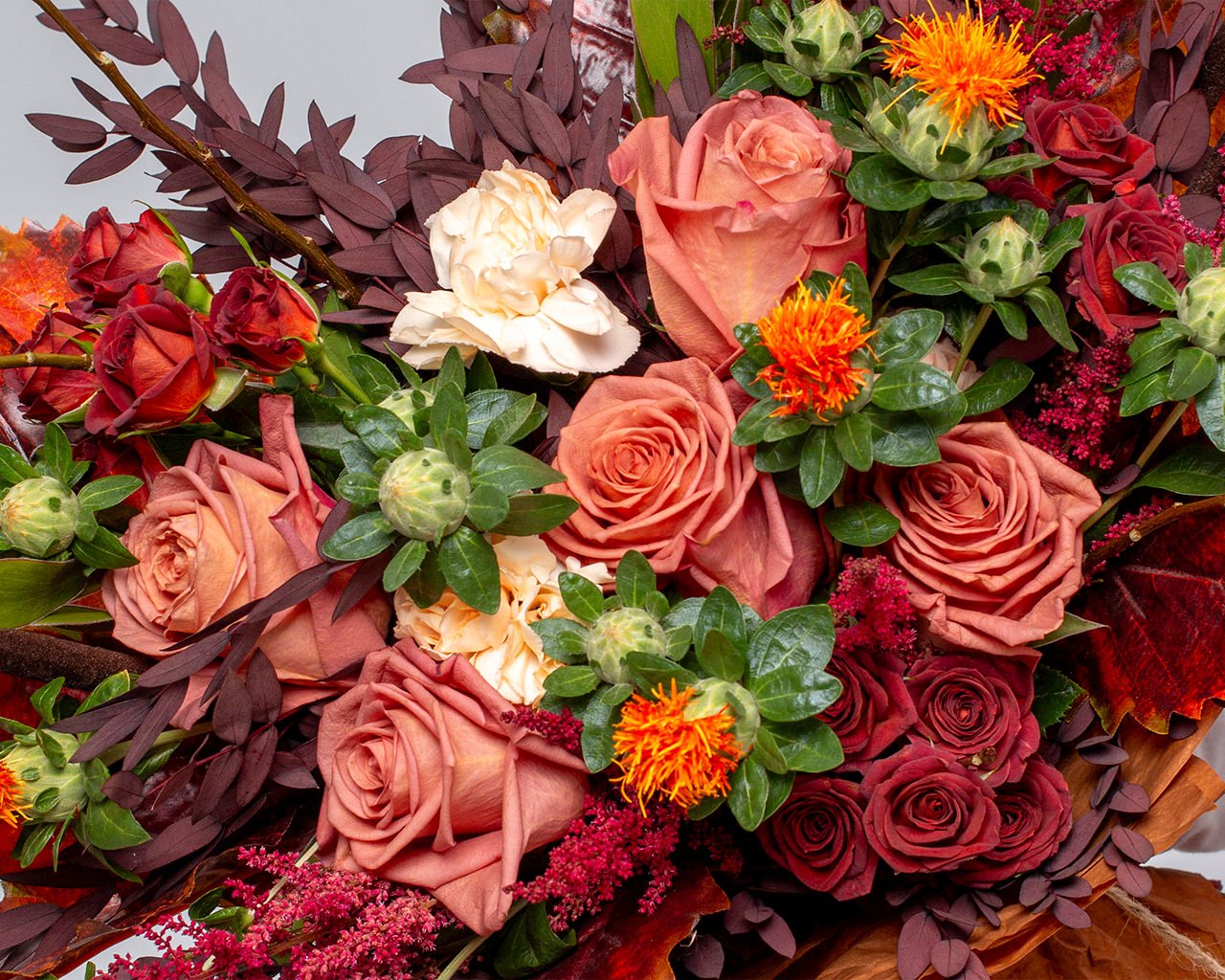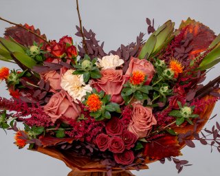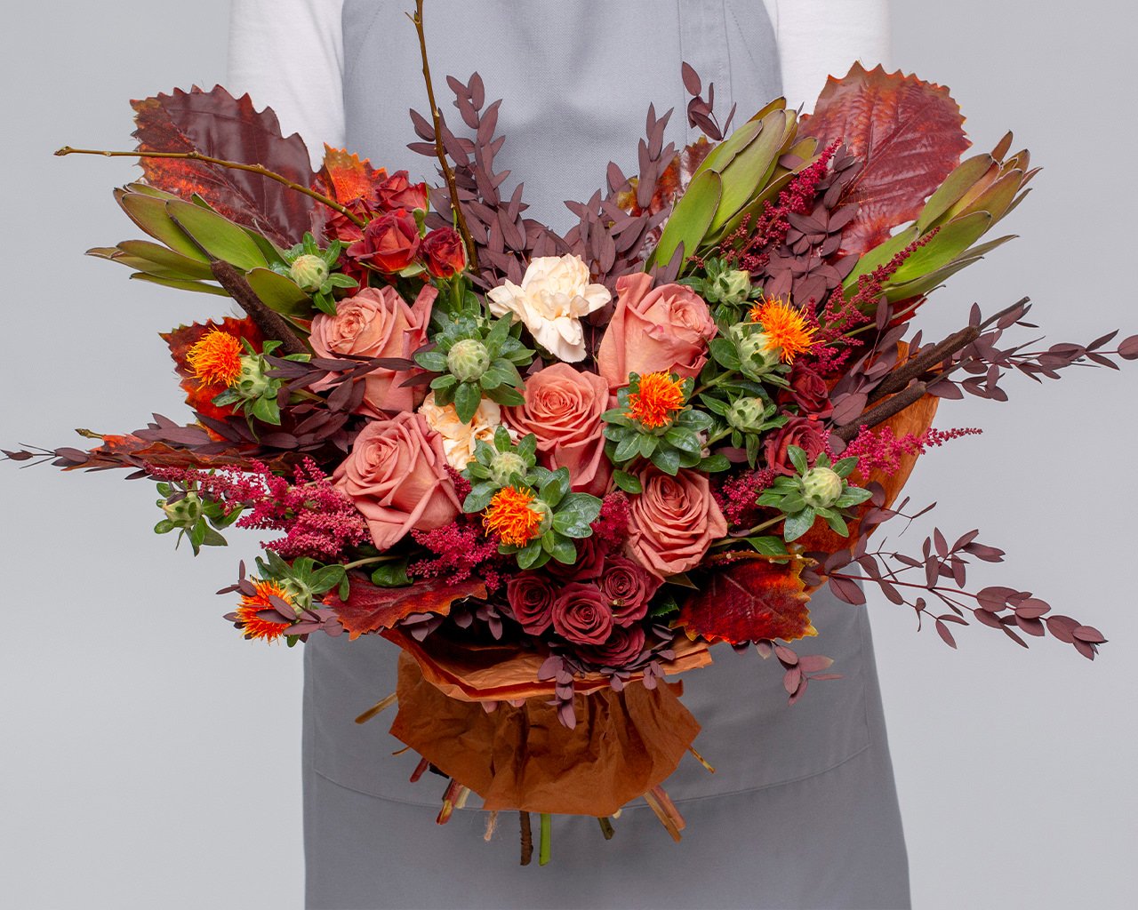 Состав: роза Эквадор 40-50 см 5 шт., гвоздика 3 шт., картамус 3 шт., исск дуб 2 шт., роза садовая куст. 5 шт., эвкалипт стаб. 0,5 шт., астильба 5 шт., сафари 3 шт., берк 5 шт., пленка 2 шт., лента 2 шт.