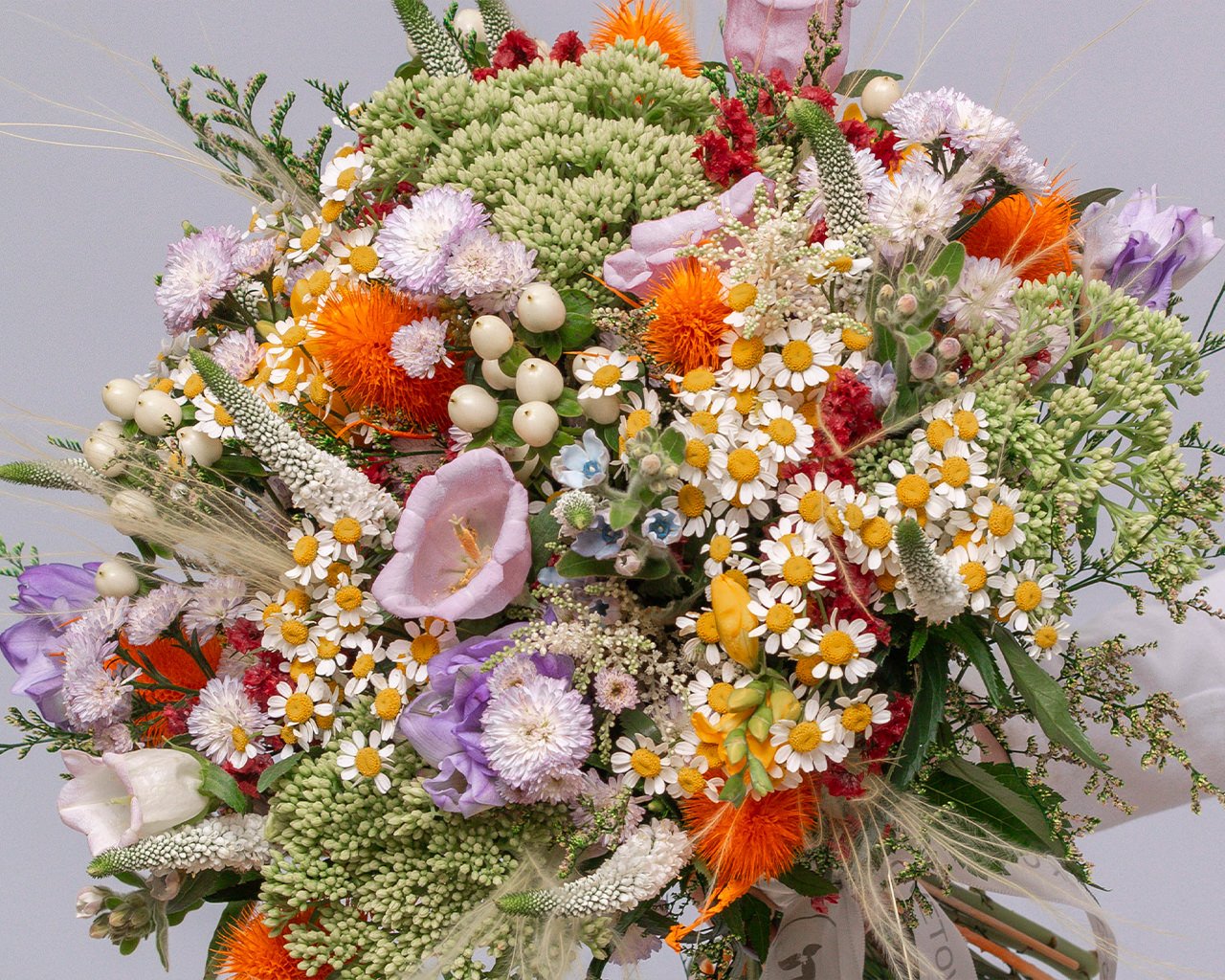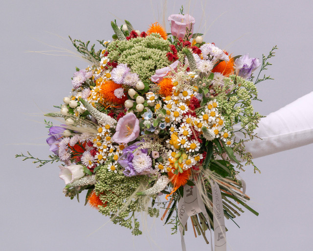 Состав: седум 3 шт., вероника 7 шт., астильба 5 шт., матрикария 6 шт., кампанула 5 шт., фрезия 5 шт., хиперикум 5 шт., твидия 5 шт., астра 5 шт., лимониум 4 шт., ковыль 0,5 шт., ворсянка 0,6 шт., сухоцвет 0,3 шт., лента 3 шт.