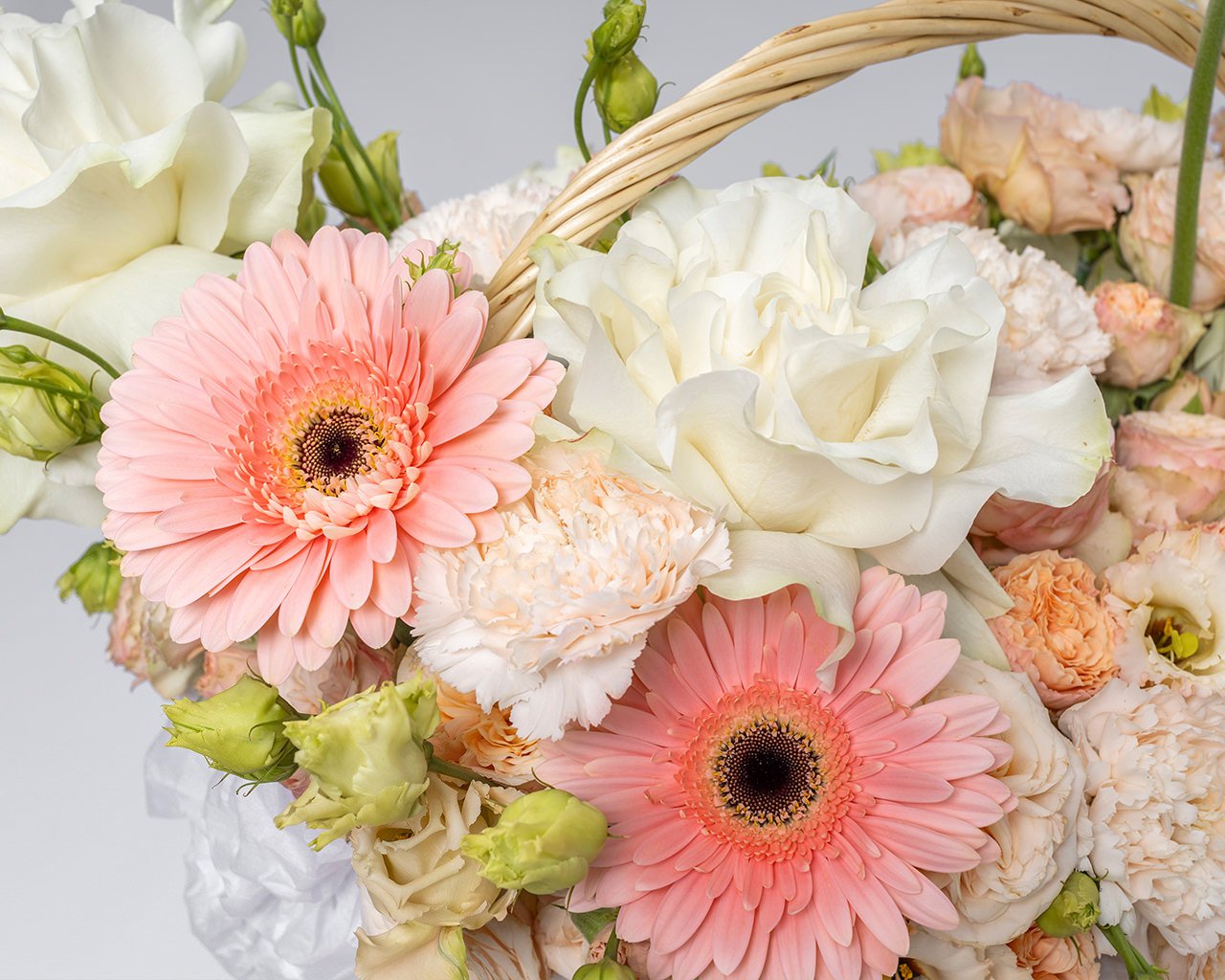Состав: гербера стандарт 3 шт., роза Эквадор 40-50 см 5 шт., гвоздика 7 шт., эустома 5 шт., садовая роза куст. 5 шт., корзина 1 шт., оазис 1,5 шт., тишью 1 шт.