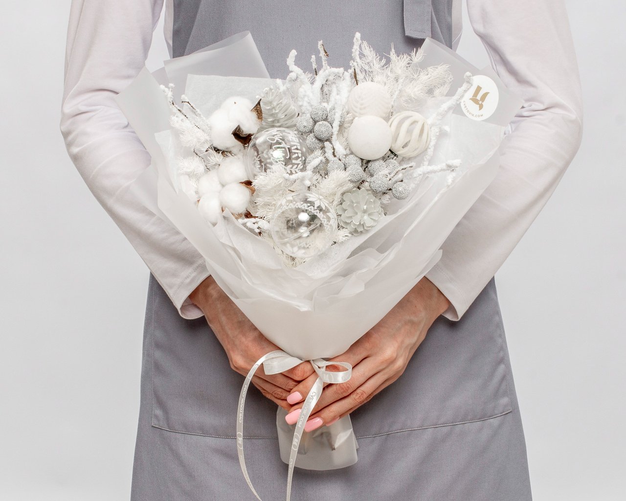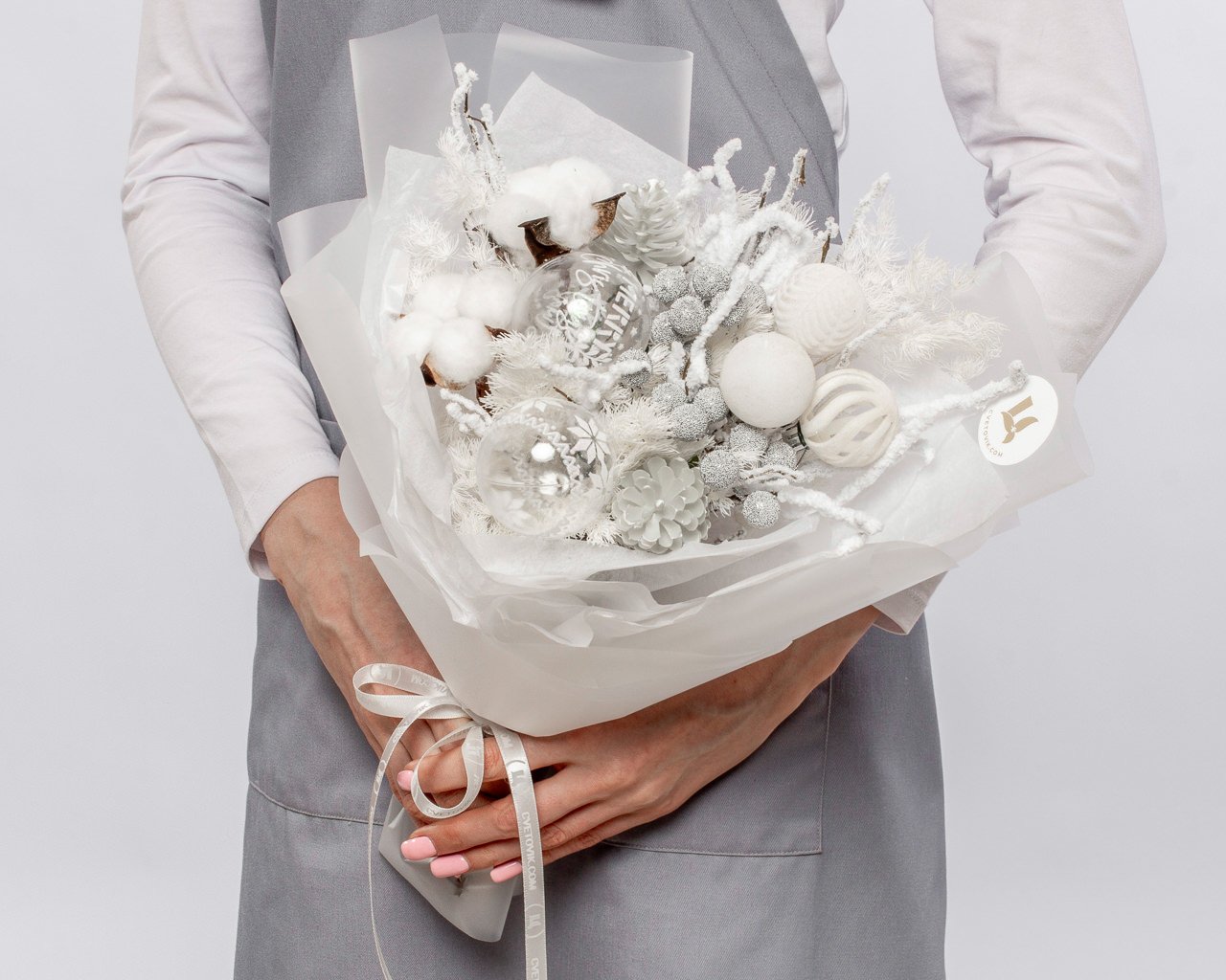Состав: хлопок 3шт., берк 5 шт., сухоцветы, новогодний декор, плёнка 2 шт., лента 1шт.