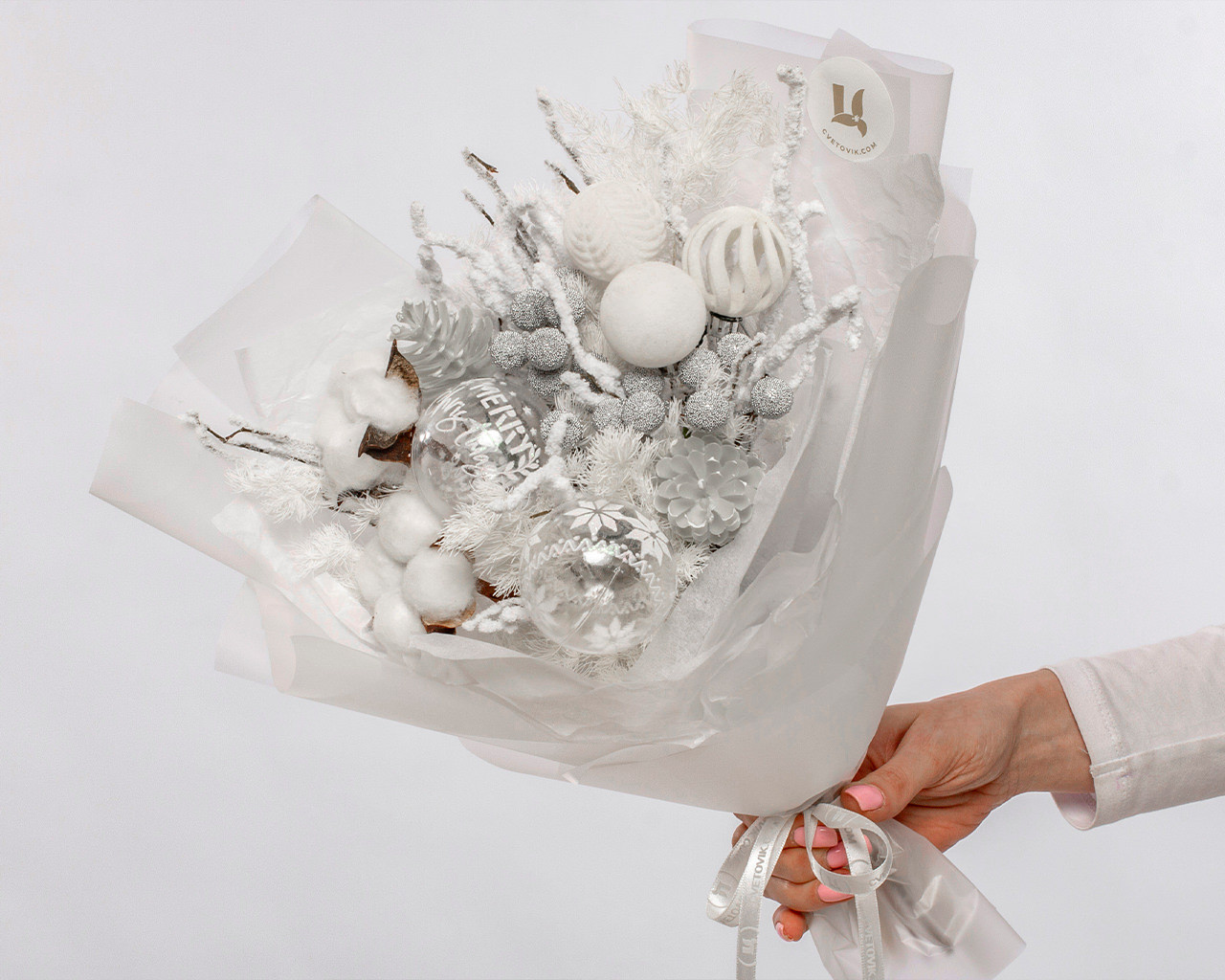 Состав: хлопок 3шт., берк 5 шт., сухоцветы, новогодний декор, плёнка 2 шт., лента 1шт.
