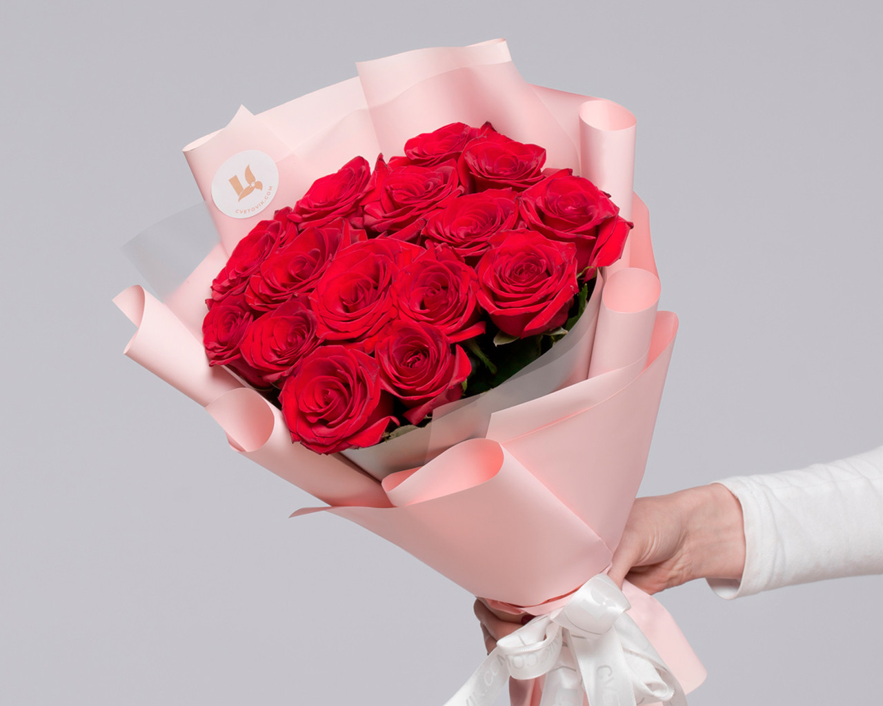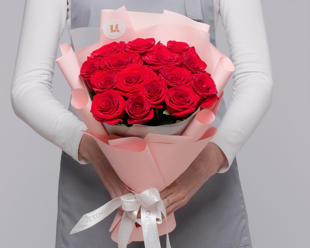 Состав: роза Россия 35-40 см 15 шт., пленка 1 шт., лента 1 шт.