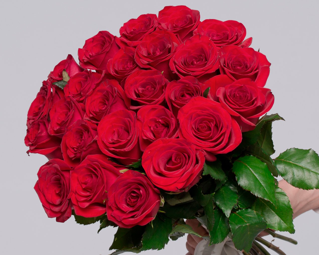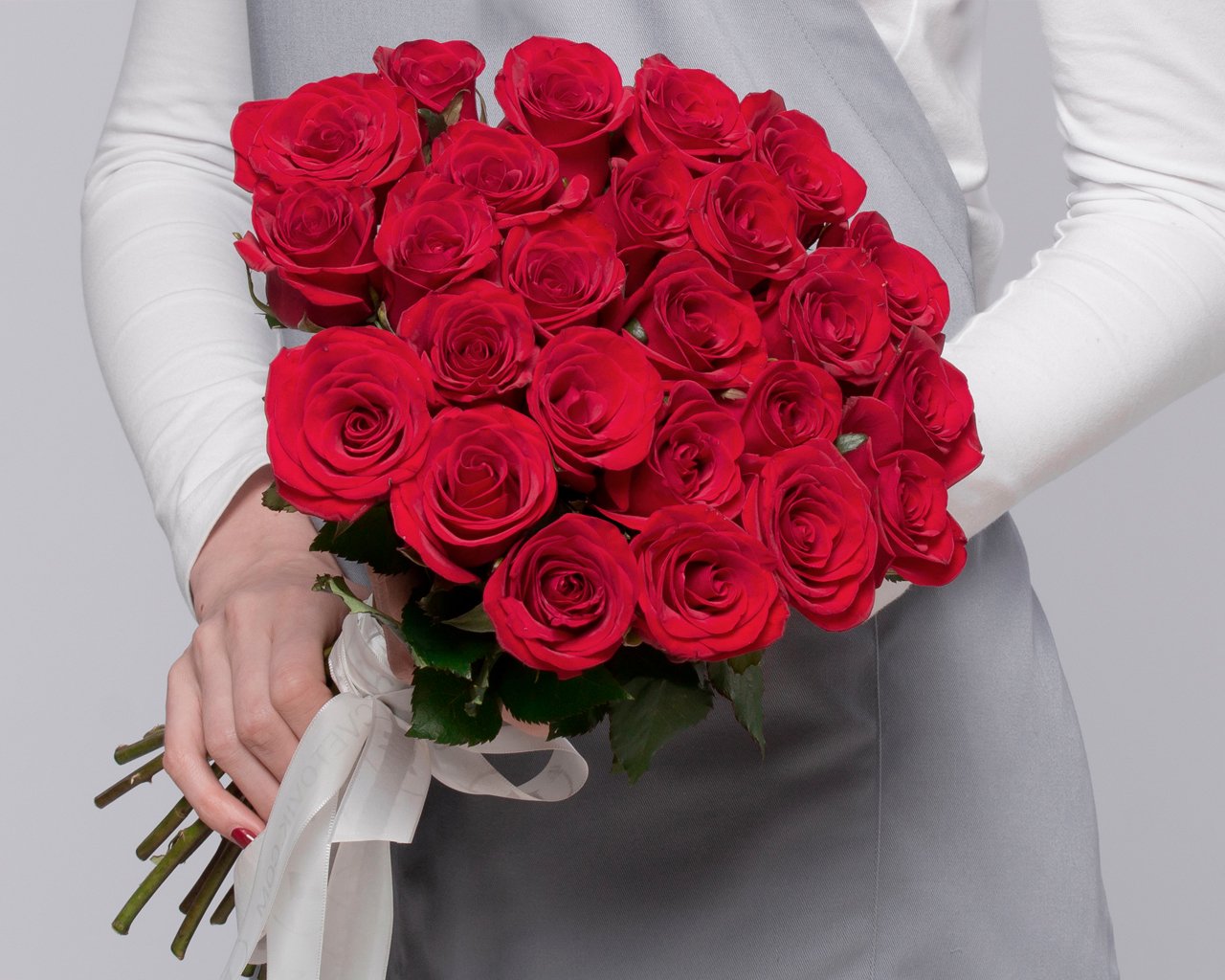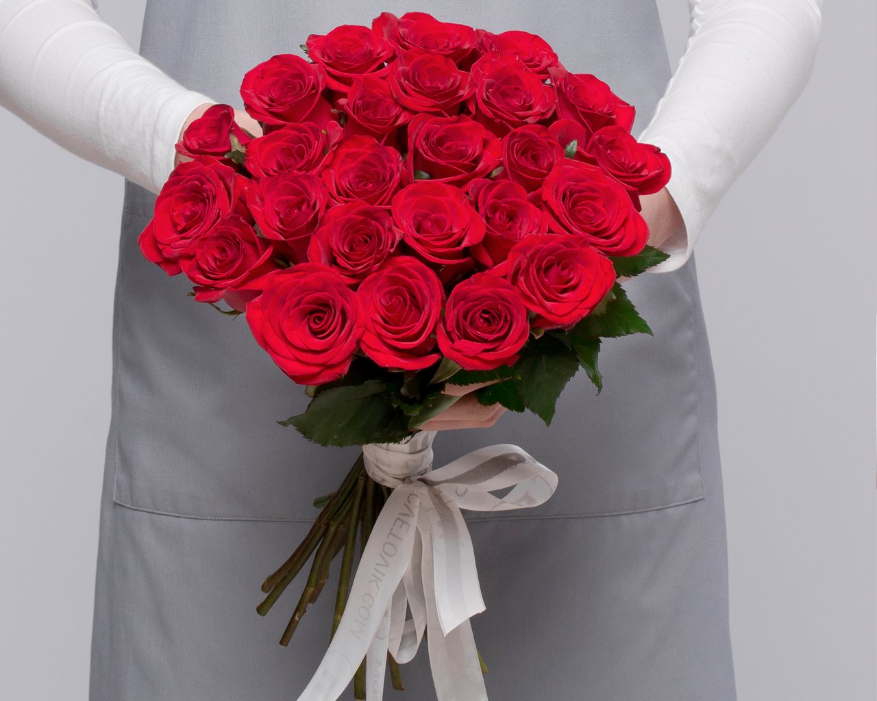 Букет из 25 красных роз 35-40 см (Россия) под атласную ленту