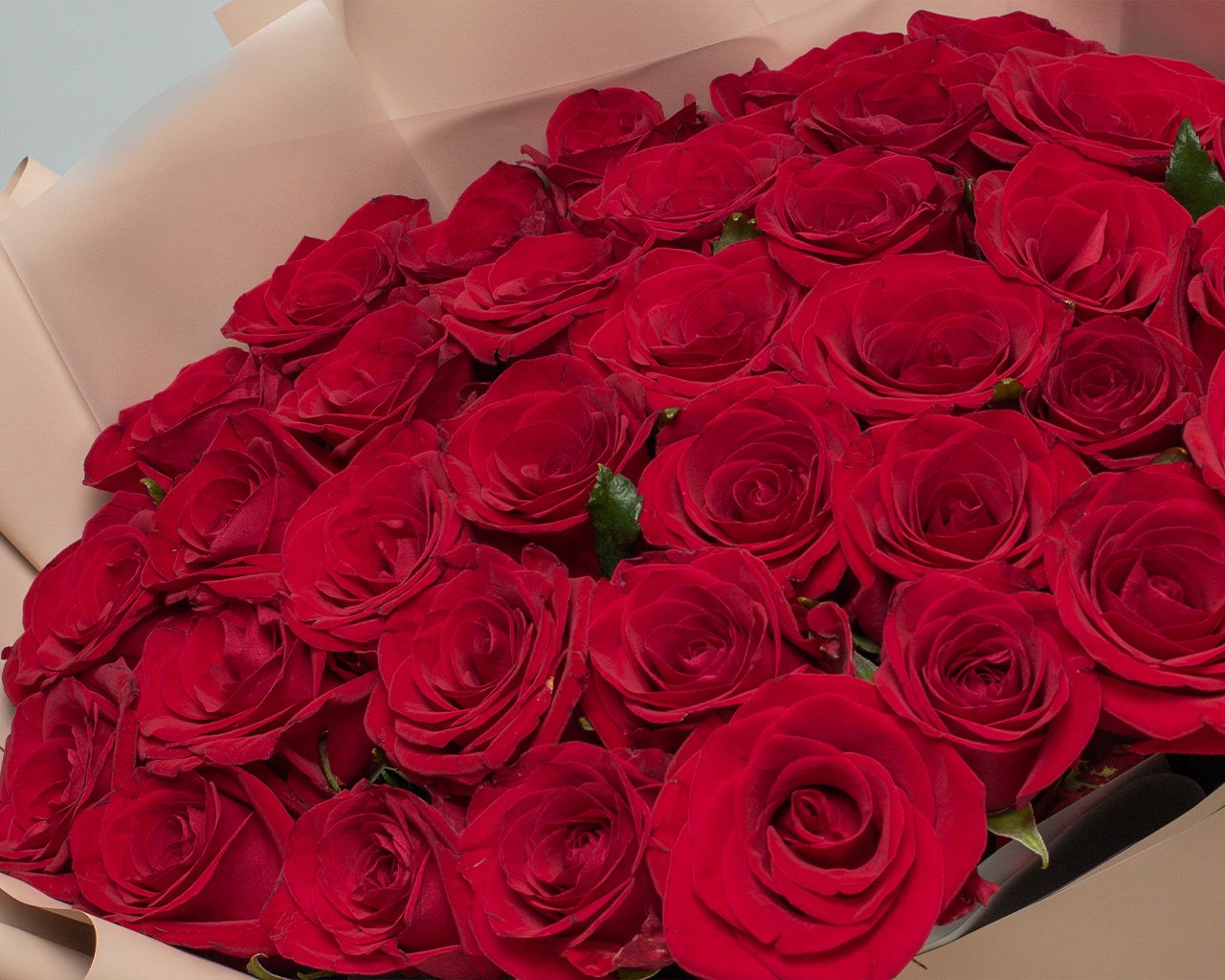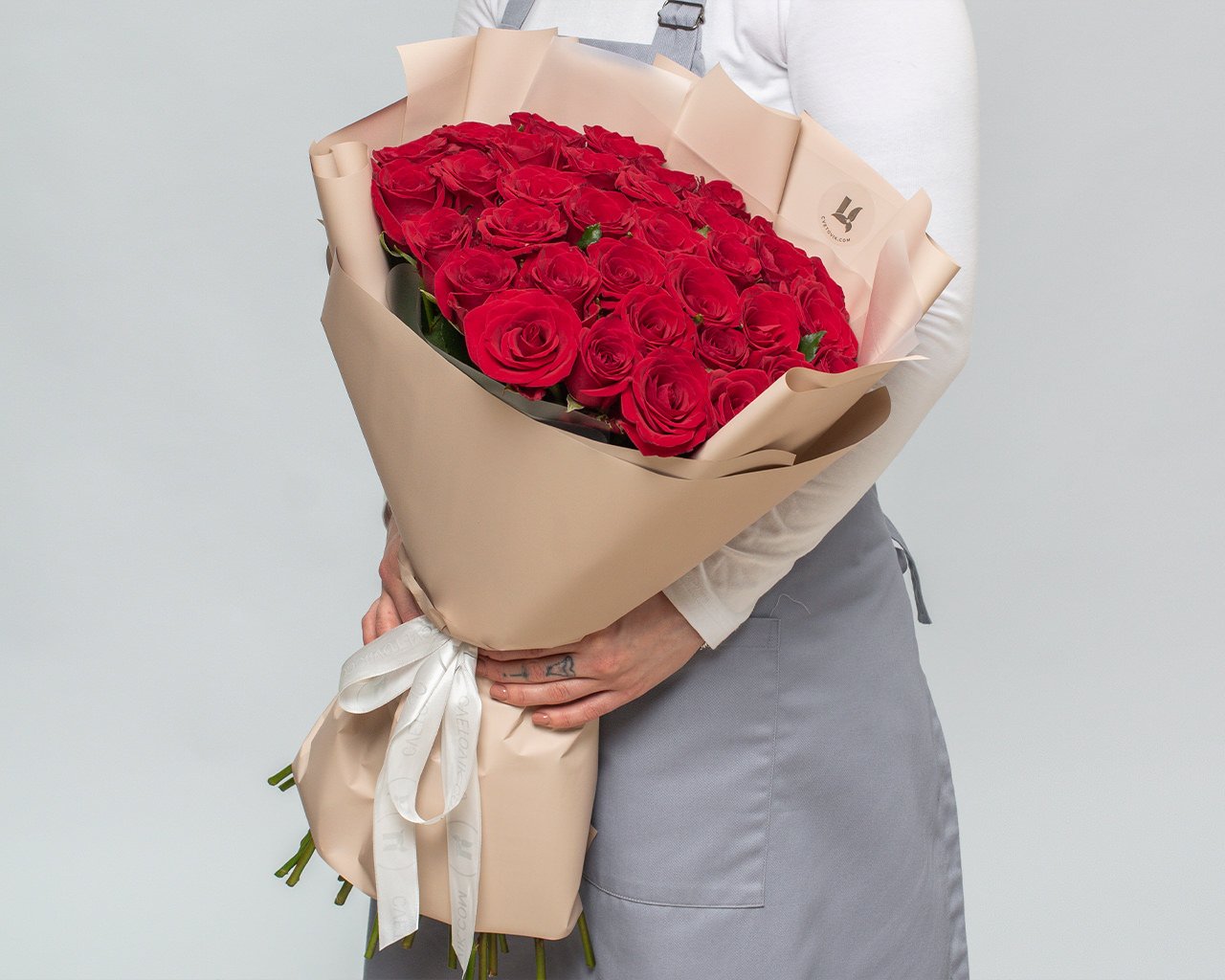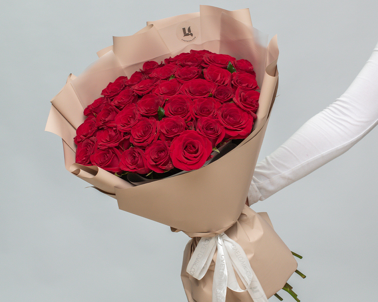 Букет из 35 красных роз 60-70 см (Россия) в упаковке