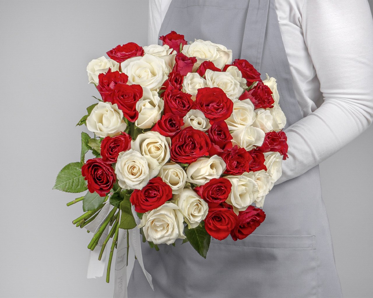 Букет из 51 красной и белой розы микс 35-40 см (Кения) под ленту