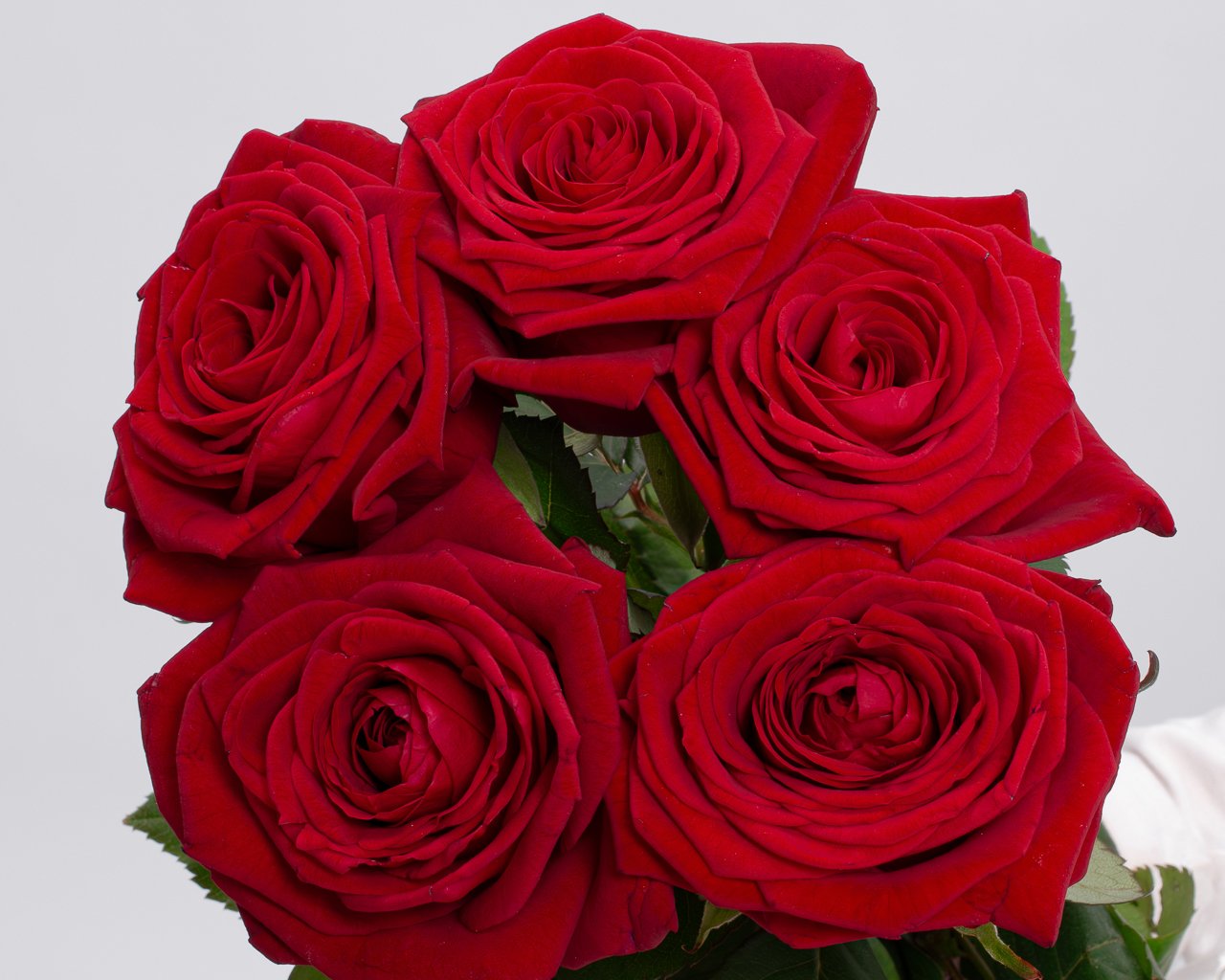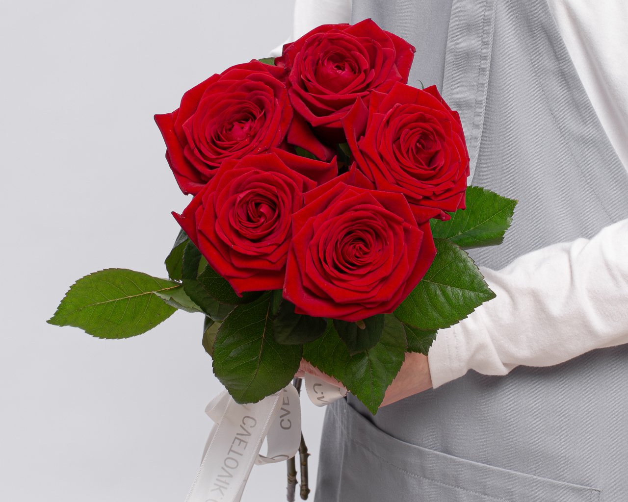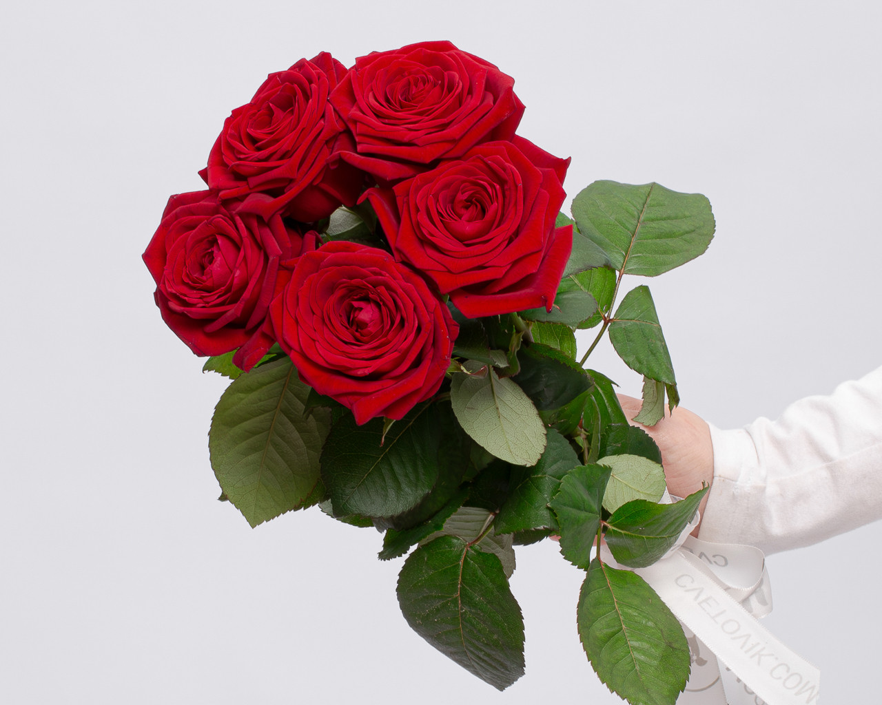 Букет из красных роз 50-60 см (Россия) под атласную ленту 5 шт