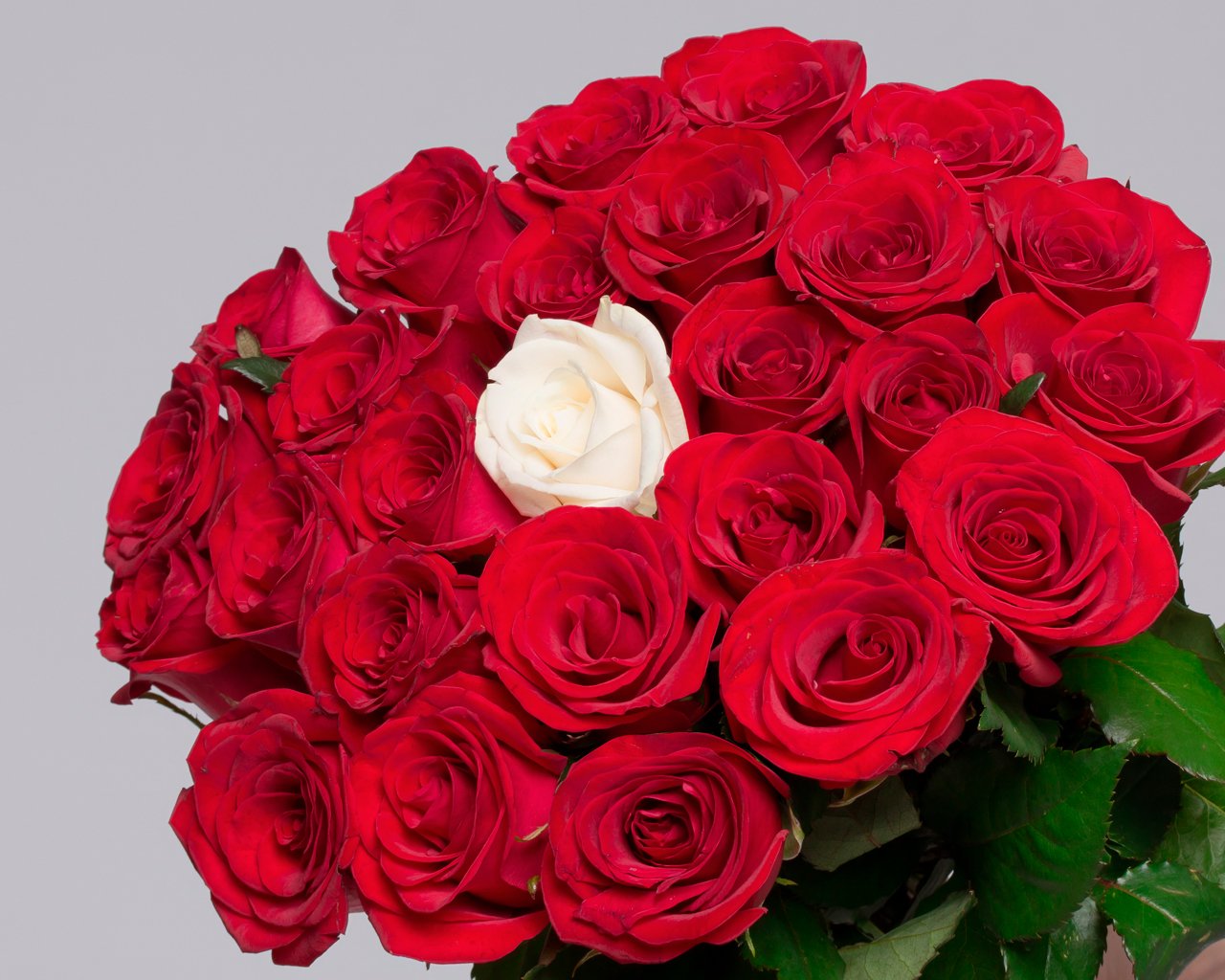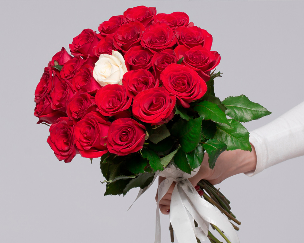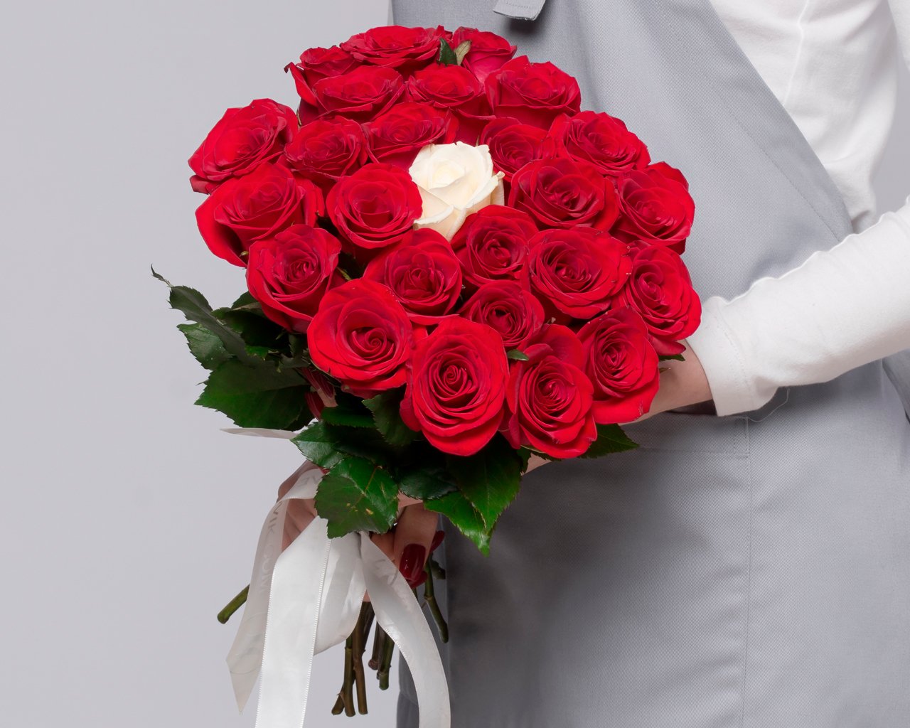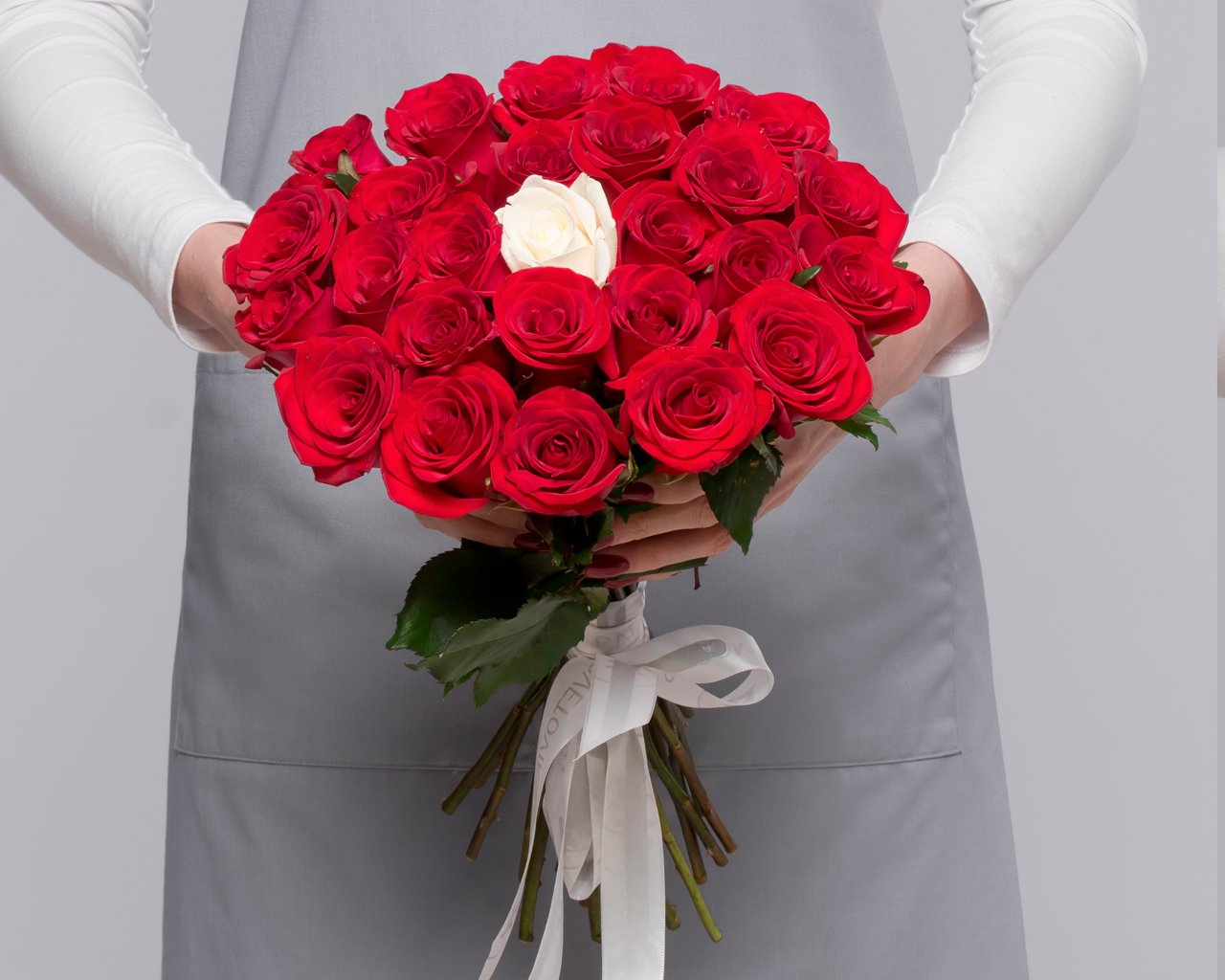 Букет из красных розы 35-40 см (Россия) с белой розой в центре 25 шт
