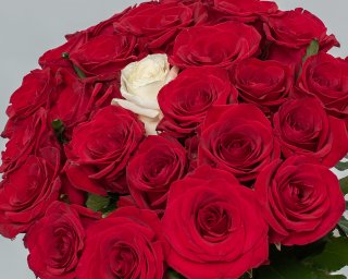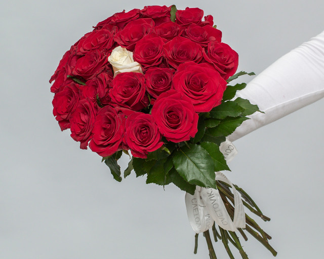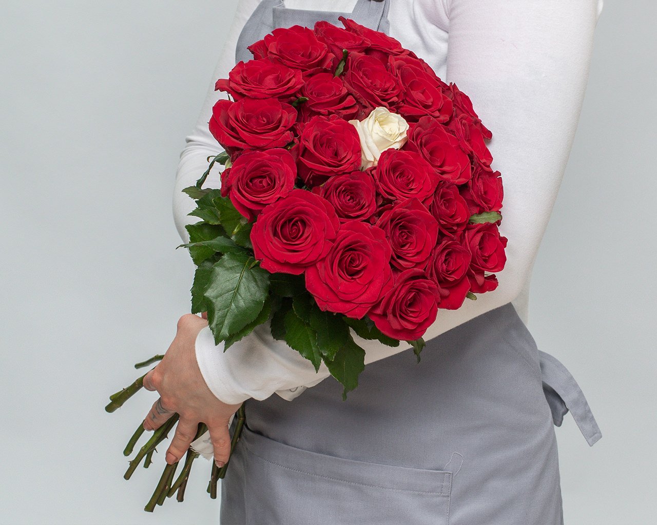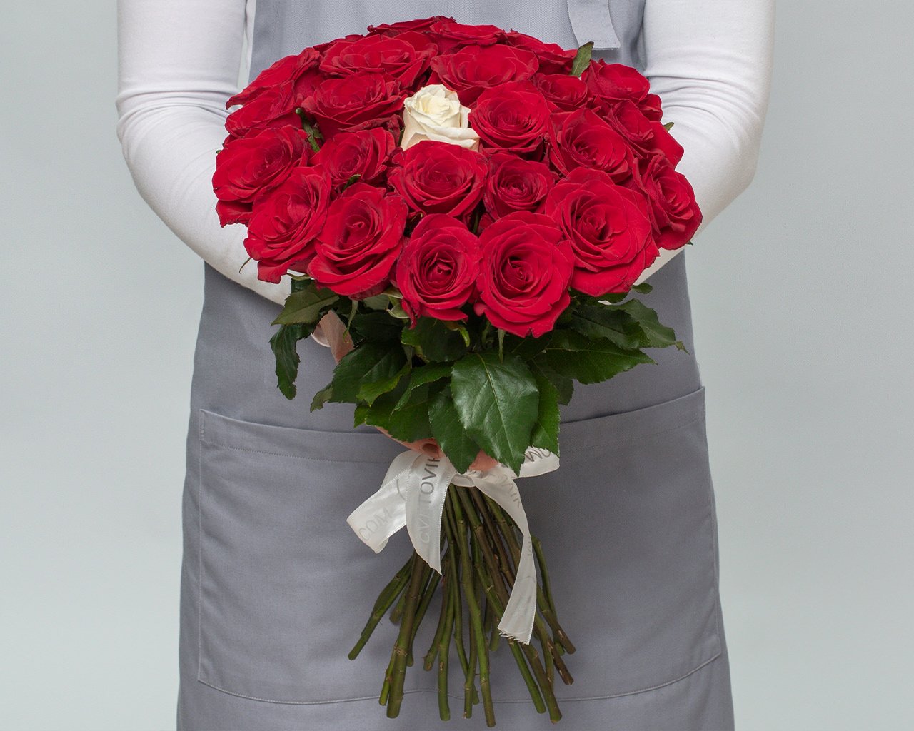 Букет из красных розы 50-60 см (Россия) с белой розой в центре 25 шт