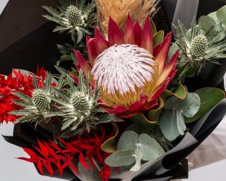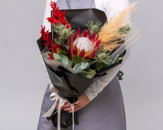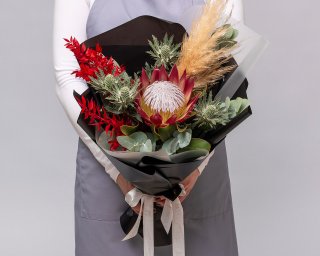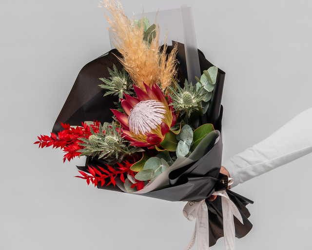Состав: протея 1 шт., эрингиум 1 шт., эвкалипт 0,3 шт., кортаделия 0,5 шт., пленка 2 шт., лента 1 шт.